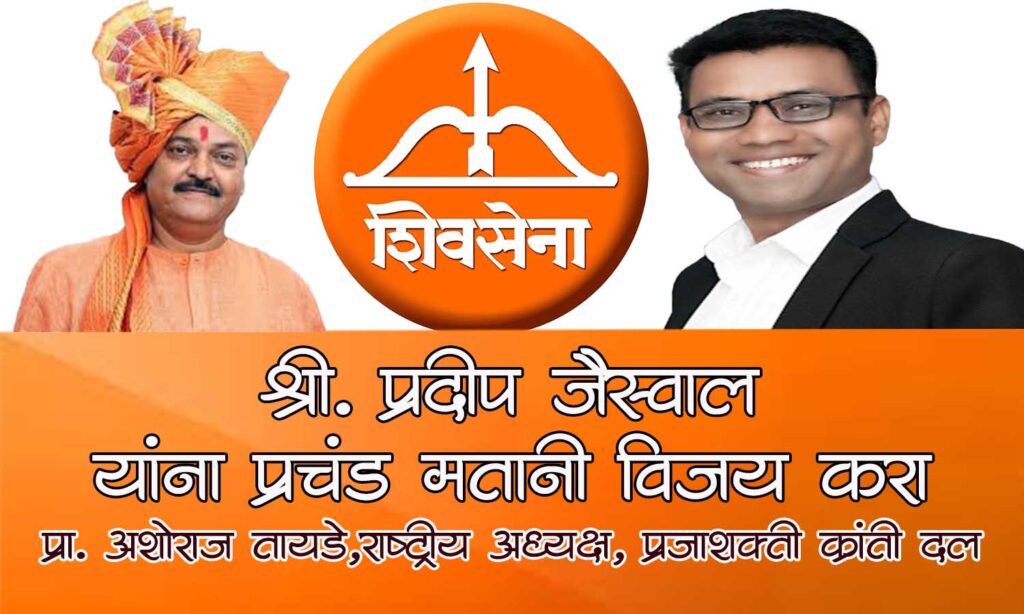 विशेष प्रतिनिधी – दिनांक १५-११-२०२४ आज रोजी महाराष्ट्र विधान सभेच्या पार्श्वभूमीवर महाराष्ट्राच्या सर्वांगीण विकासासाठी भाजप,शिवसेना,राष्ट्रवादी काँग्रेस घटक पक्ष महायुतीच्या शिवसेना पक्षाचे उमेदवार श्री. प्रदीप जैस्वाल यांना प्रचंड मतांनी विजयी करा असे आव्हान प्रजशक्ती क्रांती दलाचे राष्ट्रीय अध्यक्ष प्रा. अशोराज तायडे यांनी आज रोजी मतदारांना सोशल मीडियाच्या माध्यमातून केले.